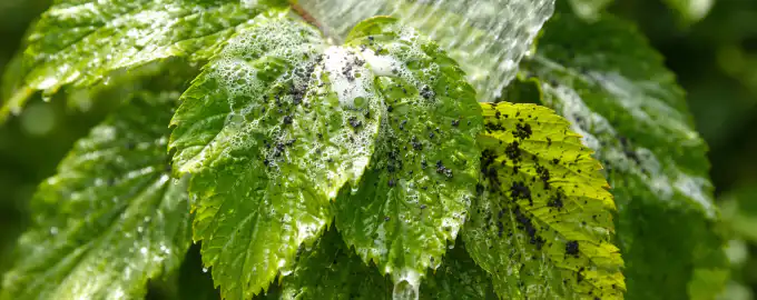 Gekrulde bladeren en plakkerige plekken op de aardappel zijn een duidelijk teken dat de struik wordt aangevallen door zwarte bladluizen.