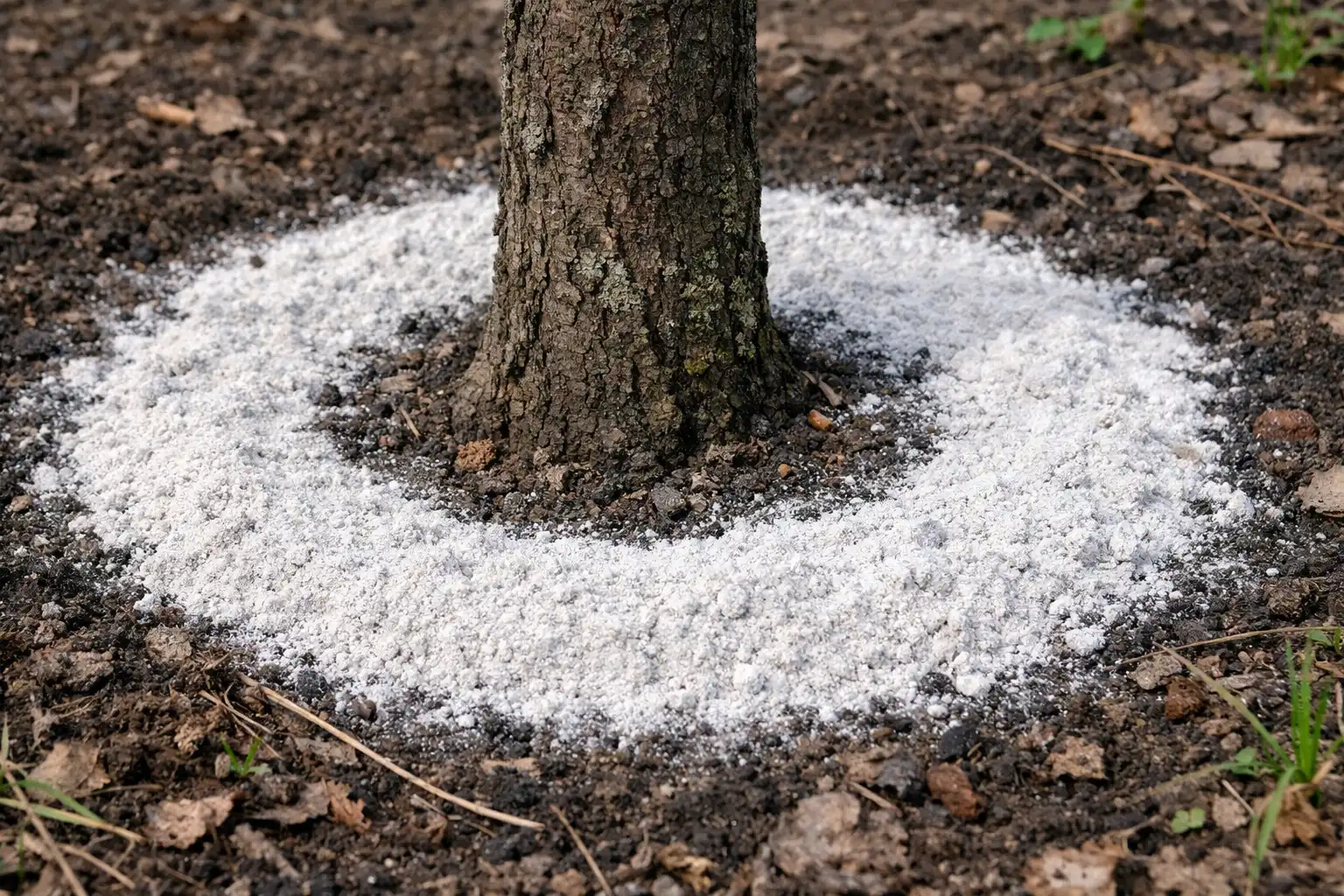 Strooien langs de kroonprojectie. Een eenvoudige methode, waarbij meel op het oppervlak van de grond wordt gestrooid en lichtjes wordt ingebed met een hark. Vereist overvloedige bewatering of neerslag.