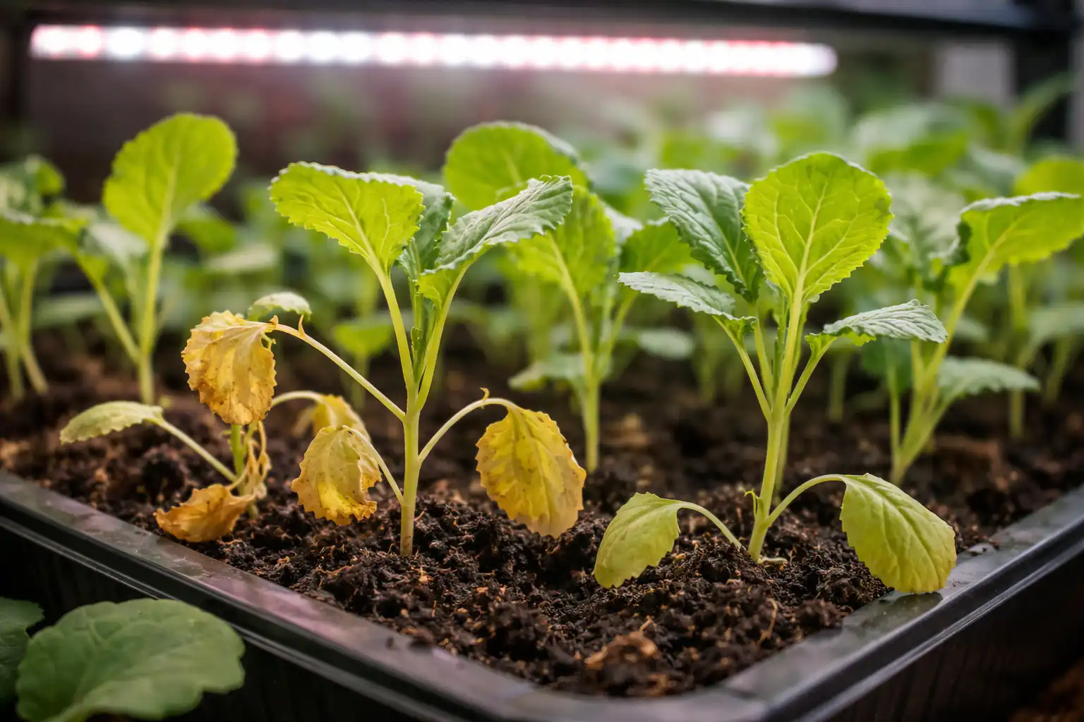 Veel tuiniers worden geconfronteerd met het feit dat sterke koolscheuten plotseling turgor beginnen te verliezen en opdrogen, ook al wordt er op tijd water gegeven. De belangrijkste reden hiervoor is de schending van fotosynthese en verdamping van vocht, wanneer de plant een catastrofaal gebrek heeft aan kwaliteitslicht. Zonder UV-licht wordt de stengel lang en broos en stopt het wortelsysteem met het leveren van voeding aan de bladeren.