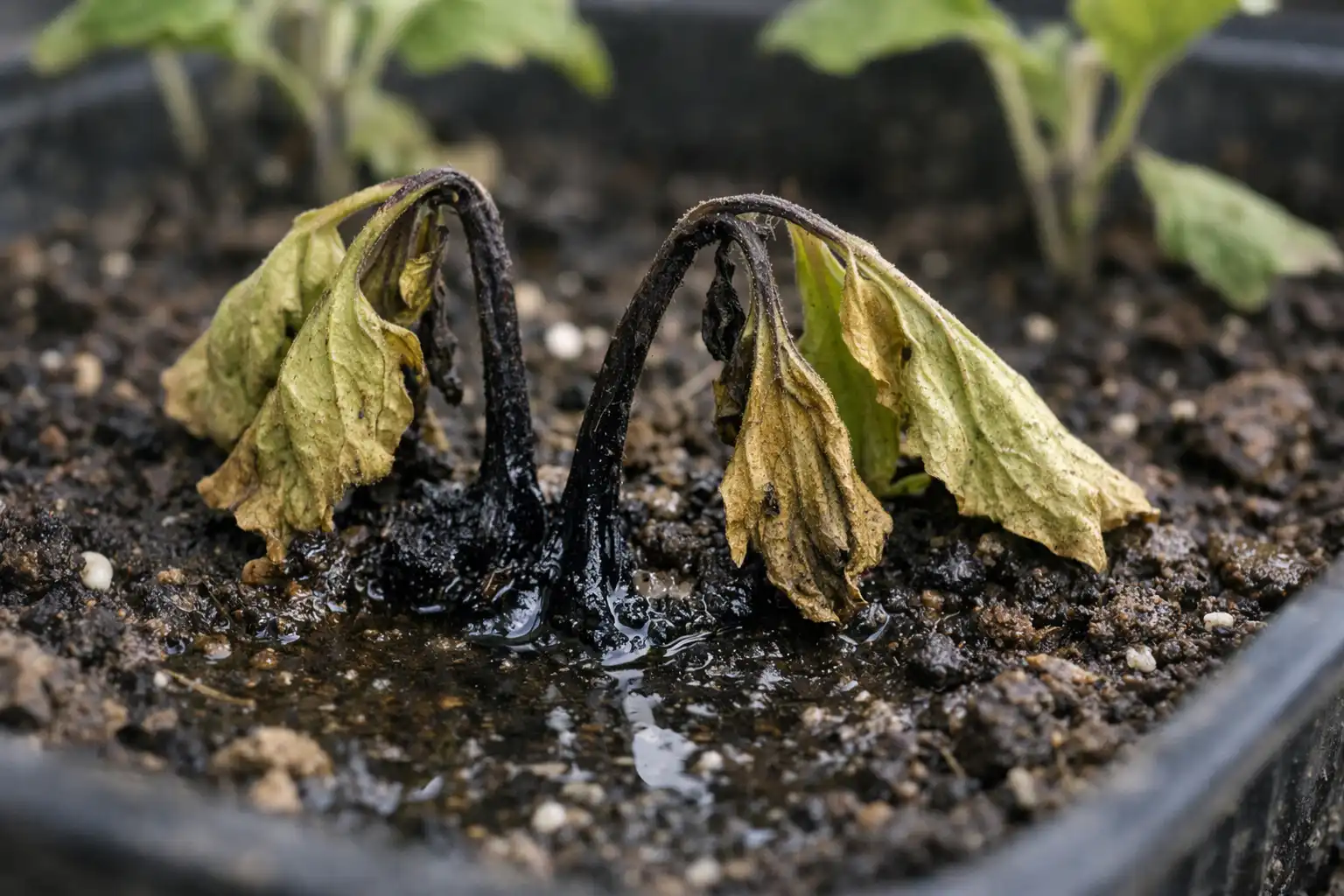 Let op de kleur van de stengel aan de basis: elke donkere verkleuring duidt op het begin van een schimmelaanval.