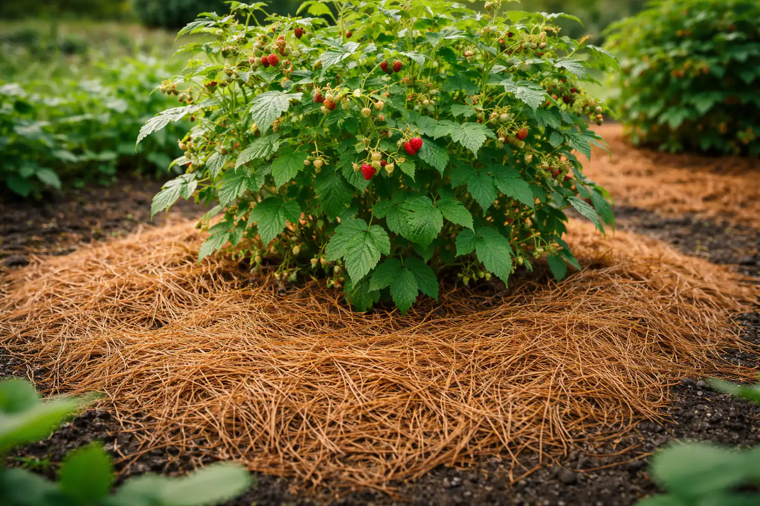 Geheime nuance: als je naaldbomen gebruikt voor gewassen die niet van zure grond houden (bijv. zwarte bessen), zorg er dan voor dat je een dun laagje grond onder de naalden strooit. essenhout of dolomietmeel.