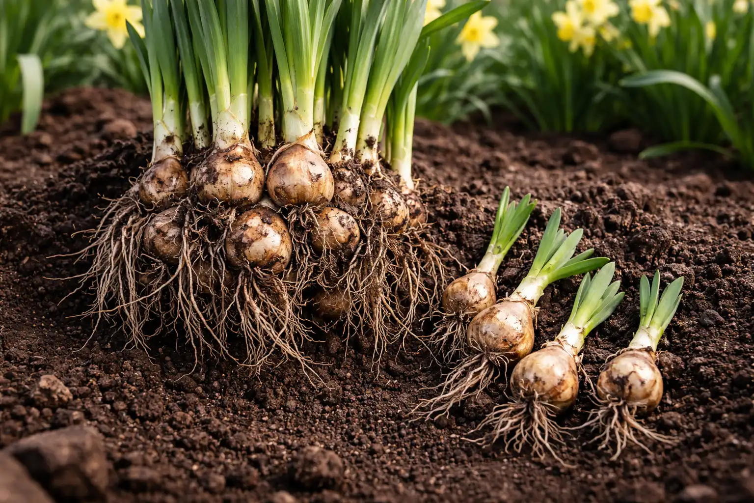 Als een bloembol meer dan vijf jaar op één plek blijft, ontwikkelt hij talloze “babyplantjes”. Het resultaat is een dichte klont waar elke individuele plant catastrofaal de voeding en ruimte mist om zijn bloemstengel volledig te ontwikkelen.