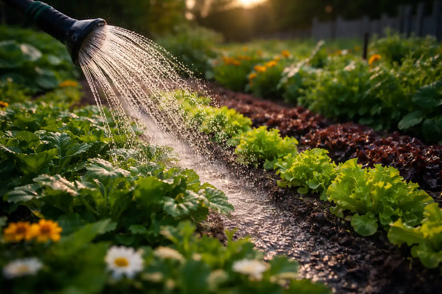 Avondbesproeiing is de meest natuurlijke manier om een moestuin in leven te houden.