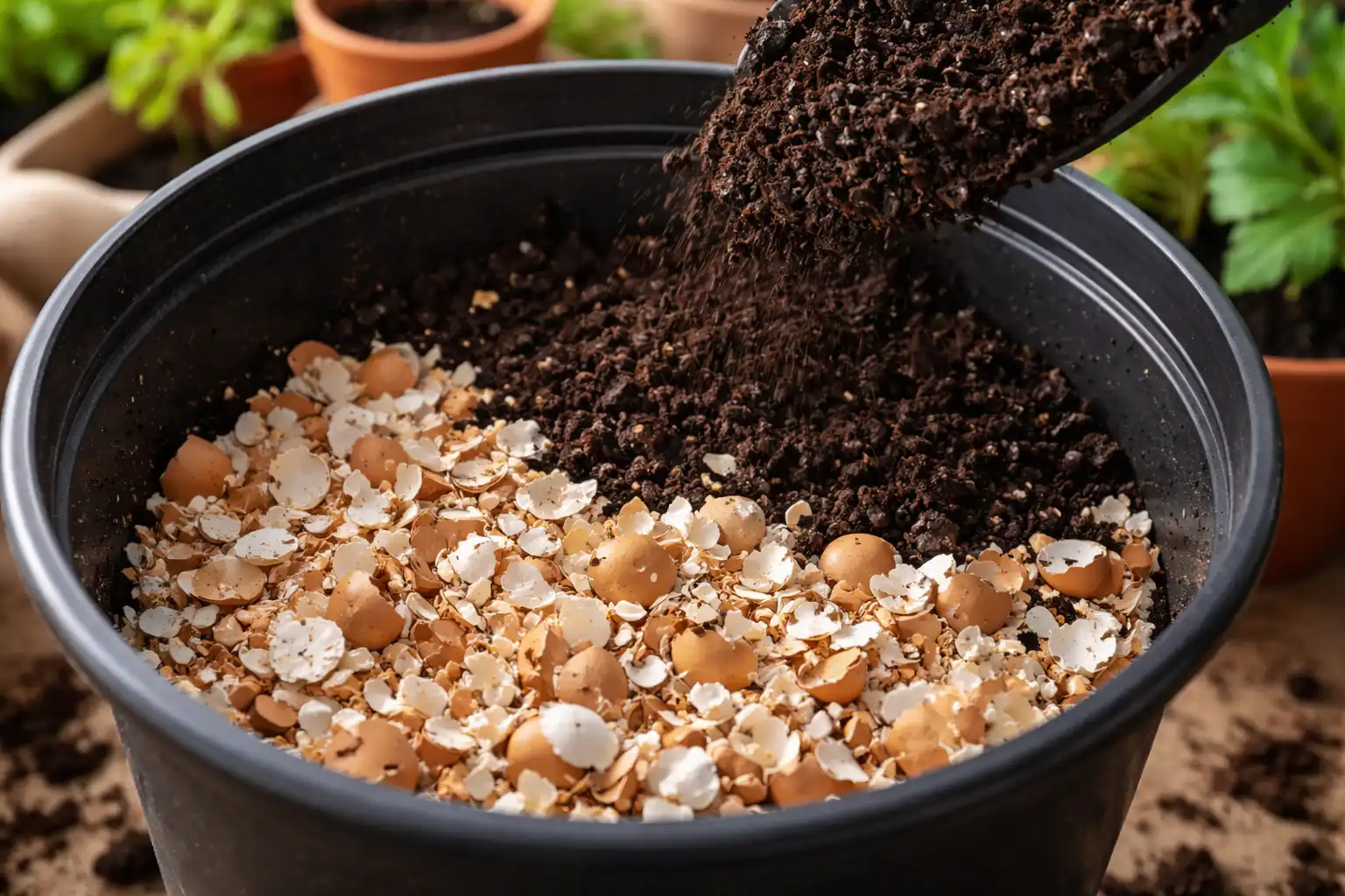 Zo’n combinatie is acceptabel, maar de eierschalen zelf vervullen de taken van drainage en bodemontzuring.