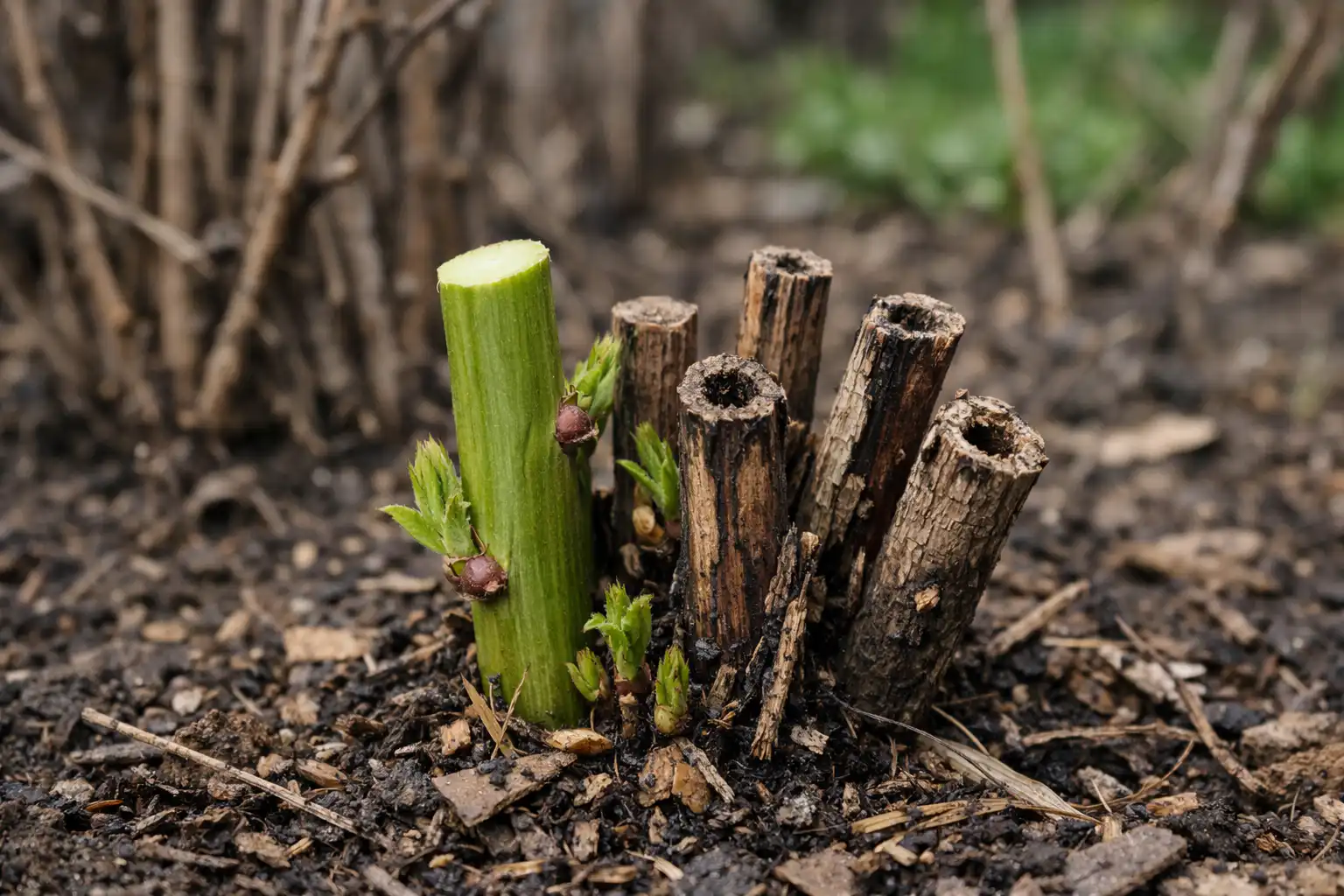 Als je hem in de herfst niet onder de wortel hebt gesnoeid, dan moet je in de lente alle vruchtdelen tot op de grond verwijderen.
