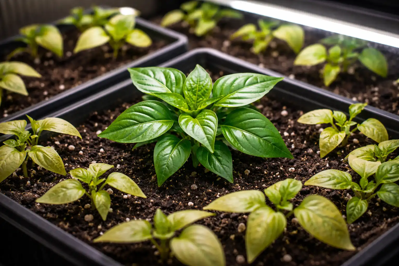 Mijn geheime nuance: als de zaailing licht begint te worden, is het niet genoeg om hem gewoon naar de zon te verplaatsen. De plant heeft bouwmateriaal nodig voor de regeneratie van chlorofyl. ijzerchelaat of magnesium. Zonder deze stoffen zullen paprika’s, zelfs onder een fytolamp, lange tijd bleek blijven.