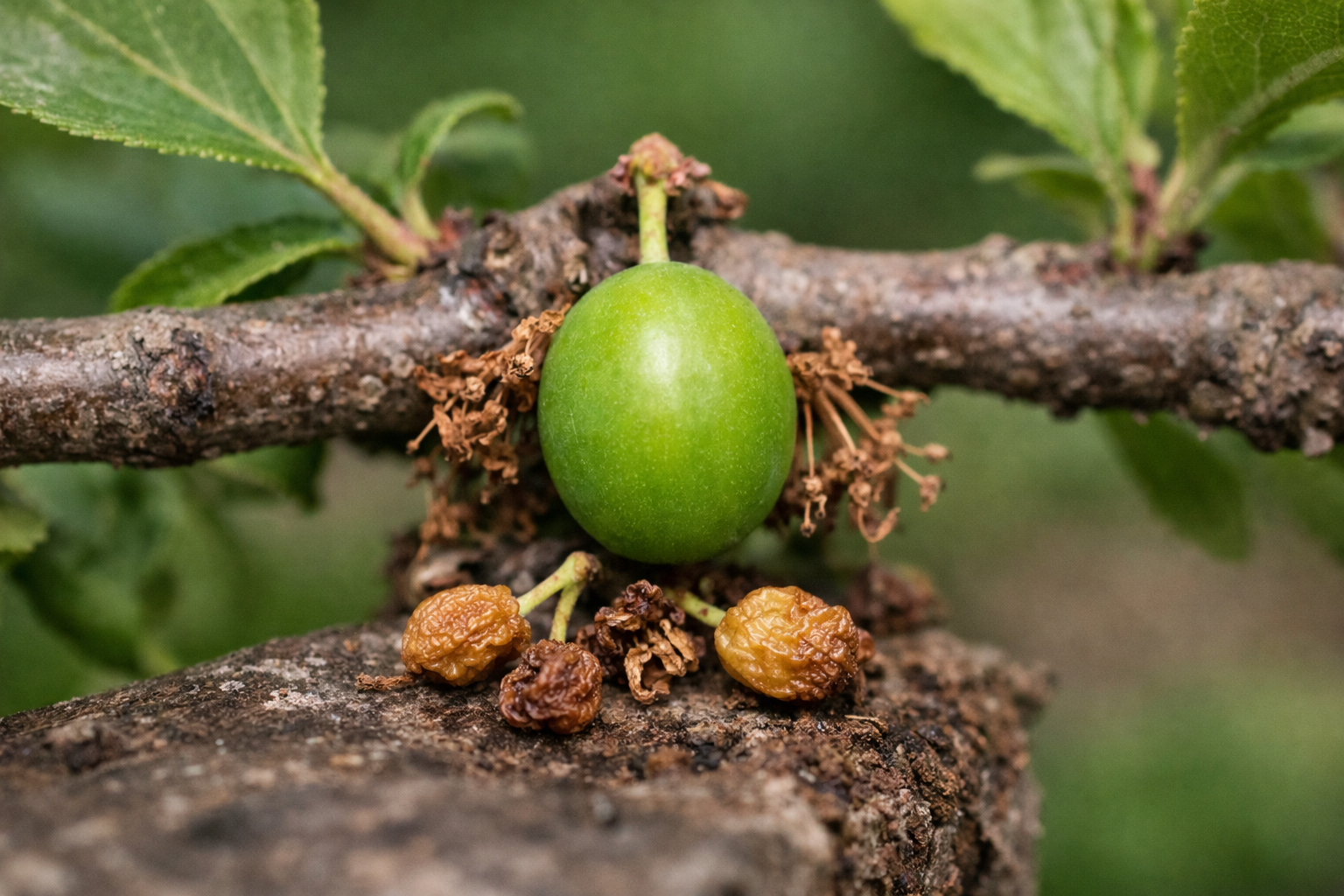 Eierstokvorming: vruchten worden geel en vallen massaal af als ze de grootte van een steen hebben bereikt.
