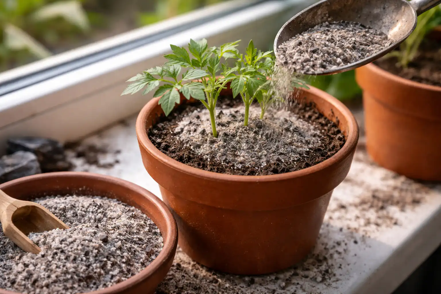 – De grond besproeien: een dun laagje as over het grondoppervlak beschermt tegen de zwartbenigheid en schimmelinfecties. – Waterinfusie: een eetlepel per liter water (24 uur laten trekken) is een zachte bewatering onder de wortel. – Toevoegen aan de grond bij het plukken: een kleine hoeveelheid droge fractie mengen met de grond geeft voeding voor een maand vooruit.
