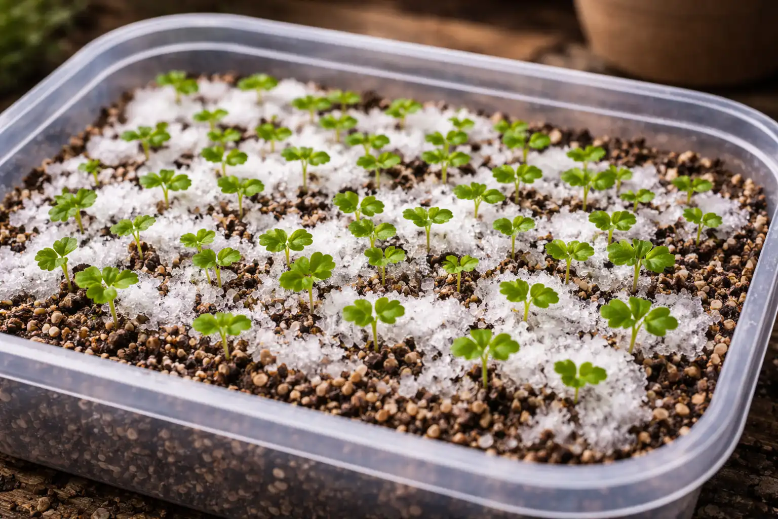 Spreid de zaden uit op het oppervlak van de bevochtigde grond, waarbij je de afstand bewaart. Bedek ze daarna met een laagje sneeuw van een paar centimeter dik. Door het smelten zal de sneeuw de zaden geleidelijk naar de ideale diepte in de grond trekken en ze tegelijkertijd verharden.