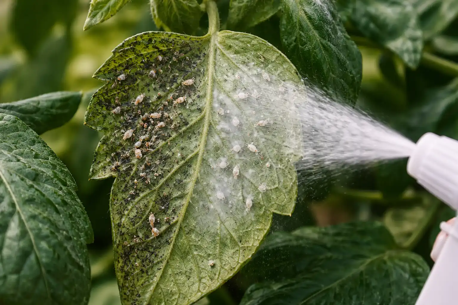 Het grootste probleem met wittevlieg is zijn ongelooflijke vruchtbaarheid en de wasachtige coating op zijn vleugels, die het insect beschermt tegen de meeste wateroplossingen. Terwijl je de bovenkant van het blad besproeit, zit de plaag stil aan de onderkant.