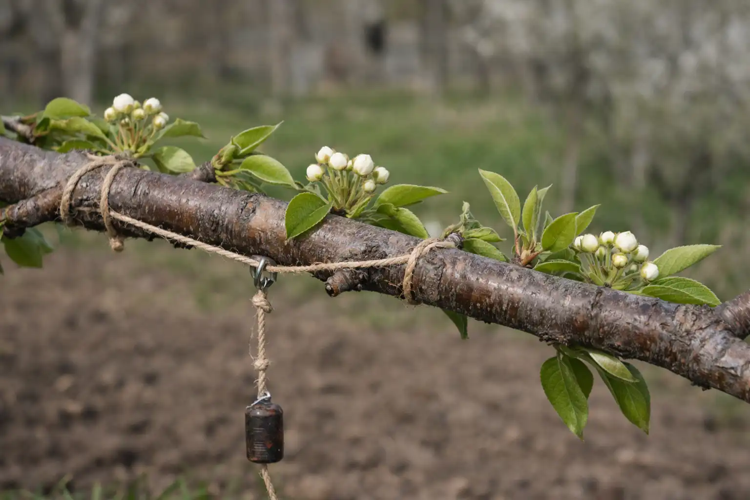 De meest effectieve flyhack die ik gebruik is om takken in een horizontale positie te dwingen. In een horizontale tak vertraagt de sapbeweging, wat een teken is voor de boom dat het tijd is om zich voort te planten.