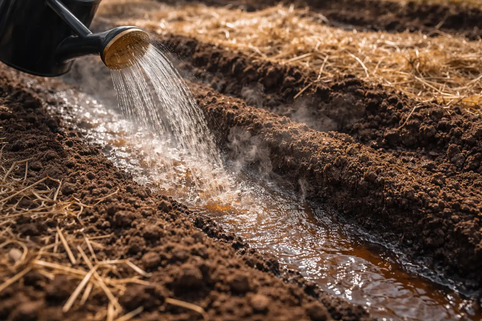 “Mijn belangrijkste geheim is om niet alleen onder de wortels water te geven, maar om de voren zelf een uur voor het planten van de zaden te doordrenken met het warme mengsel. Dit creëert een ‘warm kussen’-effect dat de groeikracht de hele nacht in stand houdt.”