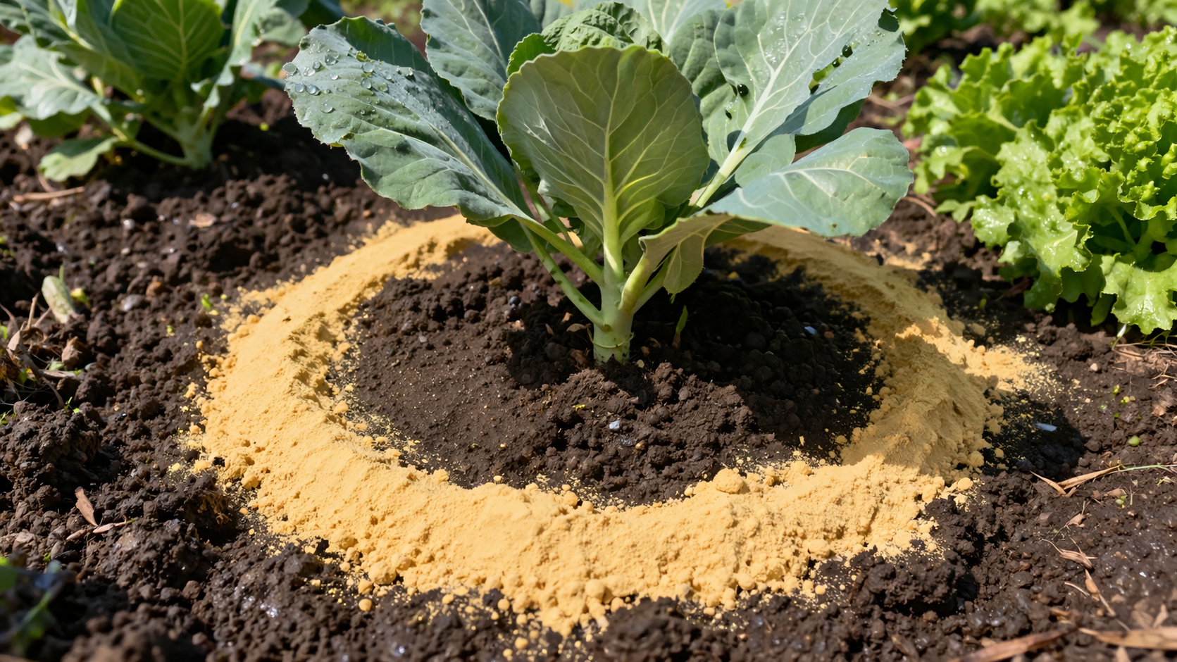 Maak ononderbroken beschermende stroken van 3-5 centimeter breed rond elk bed. – Strooi poeder op de grond direct bij de stengels van de planten die het meest kwetsbaar zijn voor aanvallen.
