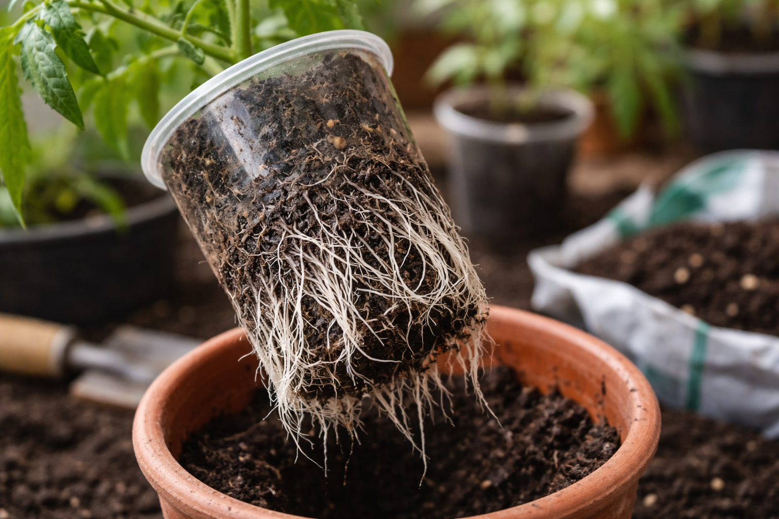 Wanneer tomatenwortels het hele volume van de beker vullen, beginnen ze elkaar te verdrukken. De plant beseft dat er niet genoeg grondstoffen zijn om de hele massa te laten groeien en begint “ballast af te werpen”. Ze neemt mobiele voedingsstoffen van de oude onderste bladeren en leidt ze naar het groeipunt.