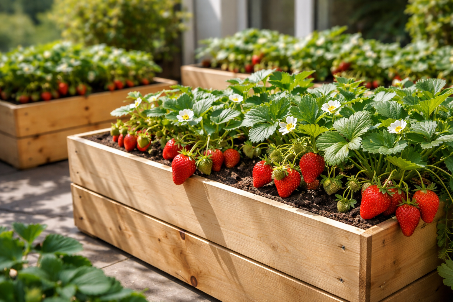 Aardbeien in emmers op de vensterbank of het terras wordt werkelijkheid