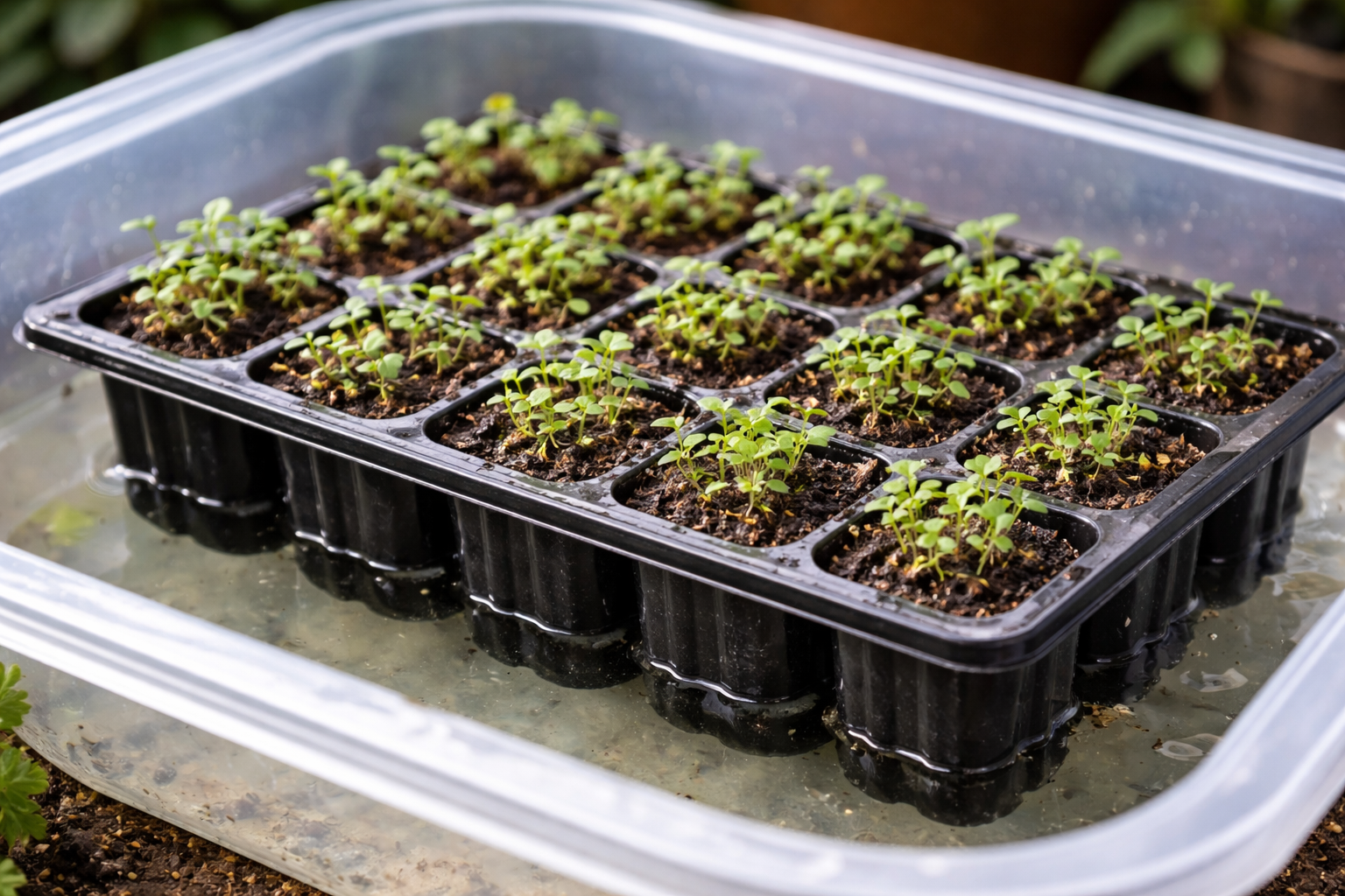 Om zwartbenigheid en gelijktijdige uitdroging te voorkomen, gebruik ik de tactiek van bodembewatering. Het water gaat direct naar de wortels en het grondoppervlak blijft matig vochtig, waardoor schimmels zich niet kunnen ontwikkelen.