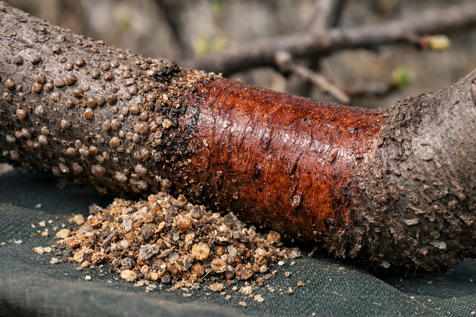 De schaal wordt droog, gemakkelijk los te maken van de schors met een vingernagel, en er wordt geen levend weefsel of nat spoor onder gevonden.